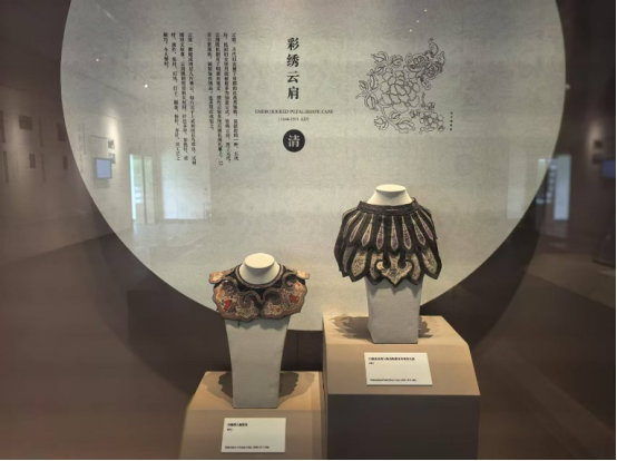 沿著展廳繼續(xù)前行,實(shí)踐隊(duì)員們來(lái)到了清代彩繡云肩的展示區(qū)域。這些彩繡云肩造型別致,由精巧的花瓣形狀拼接而成,散發(fā)著獨(dú)特魅力。湊近細(xì)看,其繡工極為細(xì)膩,針?lè)ㄘS富多樣,絲線色彩搭配和諧且富有層次感,一朵朵花卉圖案仿佛即將綻放,栩栩如生。館內(nèi)工作人員向?qū)嵺`隊(duì)員們介紹,在清代,云肩不僅僅是裝飾衣物,更是身份與地位的象征,不同樣式和繡工的云肩會(huì)出現(xiàn)在不同的禮儀場(chǎng)合。“這些彩繡云肩以其精湛技藝,承載著清代獨(dú)特的服飾文化與審美風(fēng)尚,讓我們深刻體會(huì)到絲綢在古代社會(huì)生活中的重要地位?!睂?shí)踐隊(duì)隊(duì)長(zhǎng)韓同學(xué)說(shuō)道。