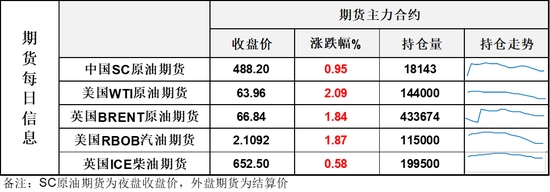 【1】WTI主力原油期貨收漲1.31美元,漲幅2.09%,報(bào)63.96美元/桶;布倫特主力原油期貨收漲1.21美元,漲幅1.84%,報(bào)66.84美元/桶;INE原油期貨收漲0.95%,報(bào)488.2元。