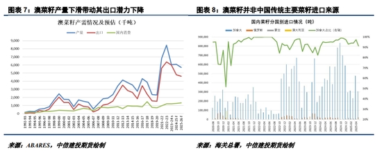 雖然后半周國(guó)內(nèi)詢價(jià)并成交澳菜籽新作的傳言打壓菜油高位回落,但不論成交真假,澳菜籽很難完全代替加菜籽。澳菜籽新作上市要到11月,較加菜籽更晚,即便進(jìn)口流程均能恢復(fù)通暢,運(yùn)到國(guó)內(nèi)壓榨也至少要到明年初。在種植面積及單產(chǎn)下降的預(yù)期下,ABARES預(yù)計(jì)澳菜籽新作產(chǎn)量570萬(wàn)噸,同比降40萬(wàn)噸,將降低其出口潛力,而澳菜籽傳統(tǒng)出口市場(chǎng)并不包括中國(guó)。在加菜籽出口潛力大降的背景下,澳菜籽數(shù)十萬(wàn)噸的對(duì)華供應(yīng)潛力其實(shí)很難以改變國(guó)內(nèi)菜籽及菜油偏緊的供應(yīng)格局。