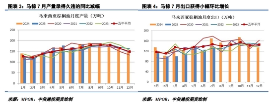 不僅如此,馬棕產(chǎn)量及出口數(shù)據(jù)亦可見(jiàn)利多端倪。馬棕7月產(chǎn)量雖有環(huán)比增長(zhǎng),但同比卻錄得1.55%降幅,這相較2季度的產(chǎn)量同比增長(zhǎng)有明顯變化。而此前有研究認(rèn)為,2024年2季度以來(lái)馬來(lái)半島降雨偏少,可能導(dǎo)致2025年下半年棕櫚油產(chǎn)量下降,SPP(7664, -18.00, -0.23%)OMA對(duì)馬棕8月1-10日產(chǎn)量環(huán)比降6.25%的預(yù)估加重此種擔(dān)憂。而在需求端,馬棕7月出口已獲得小幅回暖,隨印尼棕櫚油8月及9月出口稅費(fèi)連續(xù)上調(diào),馬棕后續(xù)出口有望獲得進(jìn)一步好轉(zhuǎn)。船運(yùn)機(jī)構(gòu)ITS及AmSpec分別預(yù)計(jì)馬棕8月1-15日出口較上月同期增16.5%和21.3%,對(duì)市場(chǎng)情緒帶來(lái)提振。