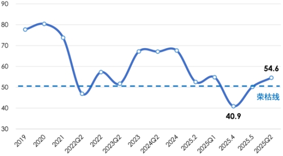 2025年上半年,世界經(jīng)濟復(fù)蘇乏力,單邊主義、保護主義加劇,多邊主義、自由貿(mào)易受到嚴峻挑戰(zhàn);國內(nèi)經(jīng)濟運行總體平穩(wěn)、穩(wěn)中向好,在復(fù)雜多變的國內(nèi)外環(huán)境中展現(xiàn)了強大的韌性和活力。我國產(chǎn)業(yè)用紡織品行業(yè)克服了國內(nèi)外多重不利因素影響,保持了穩(wěn)中有進的態(tài)勢。根據(jù)協(xié)會調(diào)研,2025年上半年我國產(chǎn)業(yè)用紡織品行業(yè)的景氣指數(shù)為54.6,處于微景氣區(qū)間(圖1)。