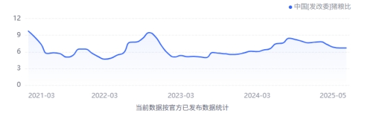 豬肉價格走勢進一步反映市場需求疲軟與通縮壓力。近期豬價持續(xù)下滑,部分地區(qū)已跌入6元區(qū)。豬糧比呈現(xiàn)波動下降趨勢,從2024年8月的8.44降至2025年5月的6.69。據發(fā)改委監(jiān)測,近日全國平均豬糧比價跌至6∶1以下。