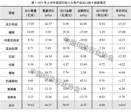 對(duì)東盟出口放緩,我國(guó)印染行業(yè)加快拓展其他出口市場(chǎng)。上半年,我國(guó)印染八大類產(chǎn)品對(duì)尼日利亞、巴西、印度、巴基斯坦等國(guó)家出口數(shù)量實(shí)現(xiàn)較快增長(zhǎng),其中對(duì)尼日利亞和巴基斯坦出口數(shù)量同比增幅分別達(dá)到66.57%和47.18%,對(duì)印度出口數(shù)量增速接近20%。從出口平均單價(jià)來(lái)看,對(duì)前十國(guó)家出口單價(jià)平均下降14.65%,其中對(duì)尼日利亞、越南和巴西出口單價(jià)降幅均高于行業(yè)整體水平。