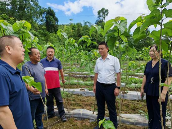專家服務(wù)團(tuán)在蓬東鄉(xiāng)與蠶農(nóng)交流,查看新栽桑苗長(zhǎng)勢(shì)