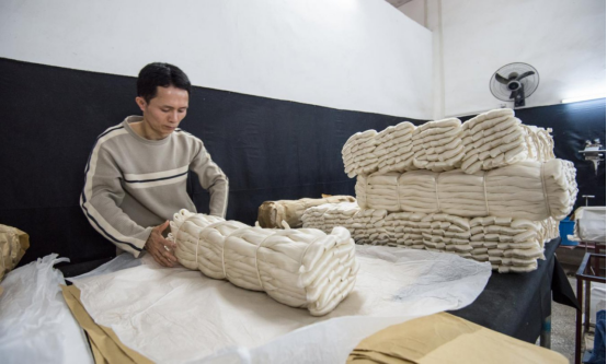 圖為東方絲路公司生絲包裝車間工人在包裝產(chǎn)品