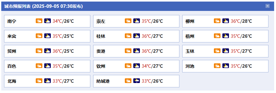今天白天到晚上,全區(qū)多云到晴,其中玉林、欽州、防城港等市有分散陣雨或雷雨。全區(qū)大部最高氣溫34~36℃、局地37℃以上。