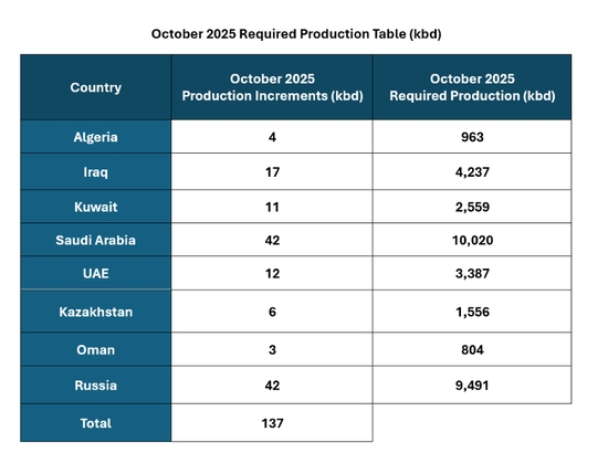 八個OPEC+國家于2025年9月7日舉行虛擬會議確認繼續(xù)增產(chǎn),聲明中稱鑒于全球經(jīng)濟前景穩(wěn)定以及當前健康的市場基本面,沙特阿拉伯、俄羅斯、伊拉克、阿聯(lián)酋、科威特、哈薩克斯坦、阿爾及利亞和阿曼八個參與國決定在10月份將石油產(chǎn)量提高13.7萬桶/日,具體細節(jié)如下表所示。根據(jù)不斷變化的市場條件,這部分或全部的每日165萬桶可以逐步返還。
