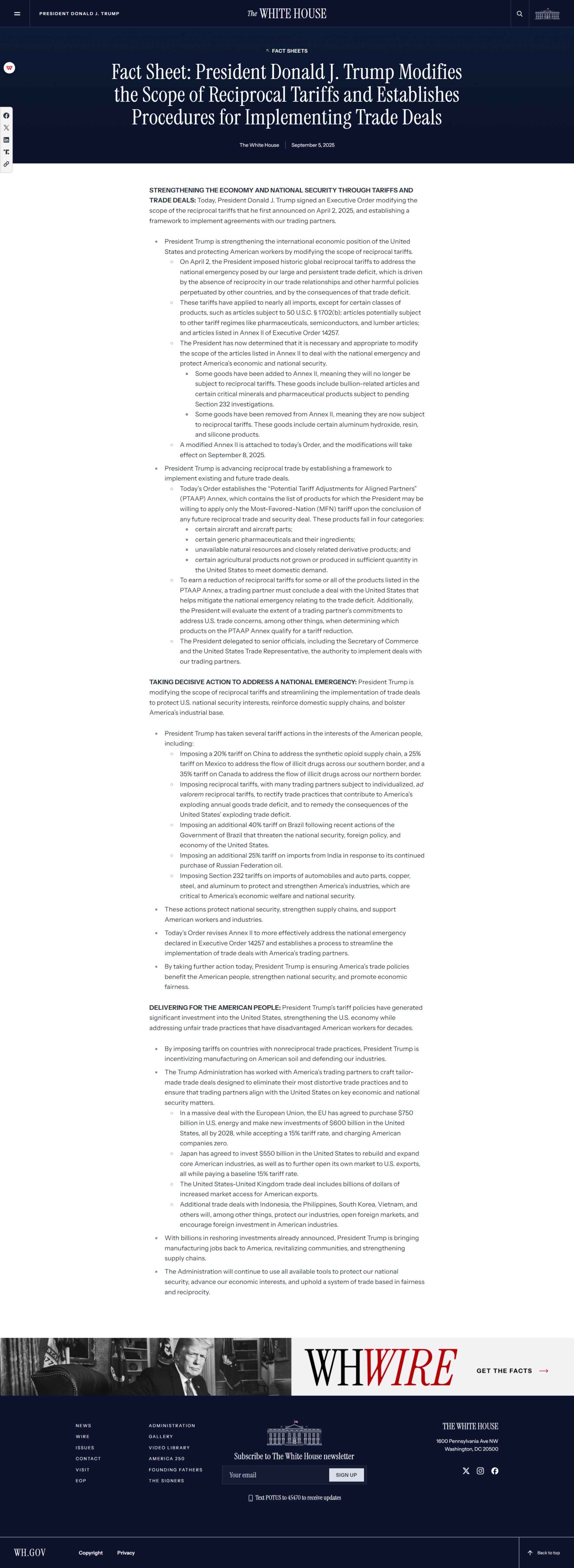 采取果斷行動應(yīng)對國家緊急狀態(tài):特朗普總統(tǒng)正調(diào)整對等關(guān)稅范圍,簡化貿(mào)易協(xié)定落實流程,以保護美國國家安全利益、強化國內(nèi)供應(yīng)鏈、鞏固美國工業(yè)基礎(chǔ)。