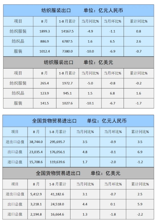 8月,紡織服裝出口265.4億美元,下降5%,環(huán)比下降0.8%,其中紡織品出口123.9億美元,增長(zhǎng)1.5%,環(huán)比增長(zhǎng)6.8%,服裝出口141.5億美元,下降10.1%,環(huán)比下降6.7%。