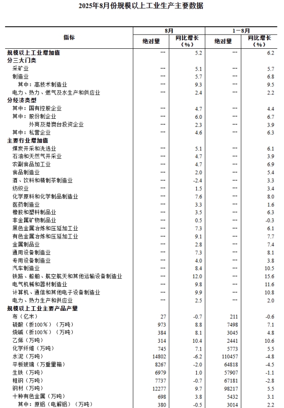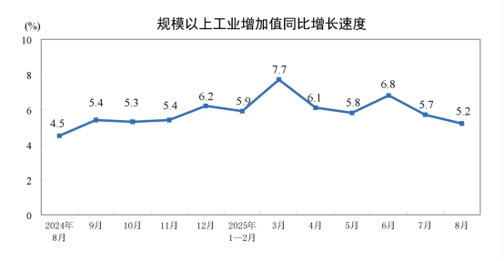 8月份,規(guī)模以上工業(yè)增加值同比實際增長5.2%(增加值增速均為扣除價格因素的實際增長率)。從環(huán)比看,8月份,規(guī)模以上工業(yè)增加值比上月增長0.37%。1—8月份,規(guī)模以上工業(yè)增加值同比增長6.2%。