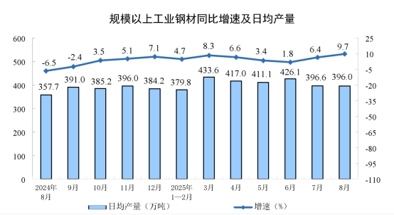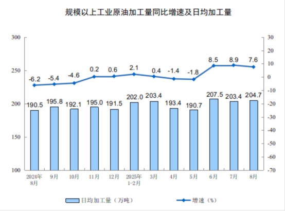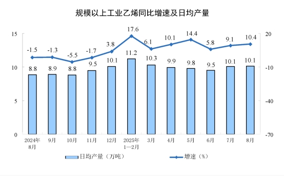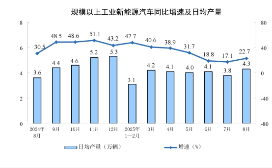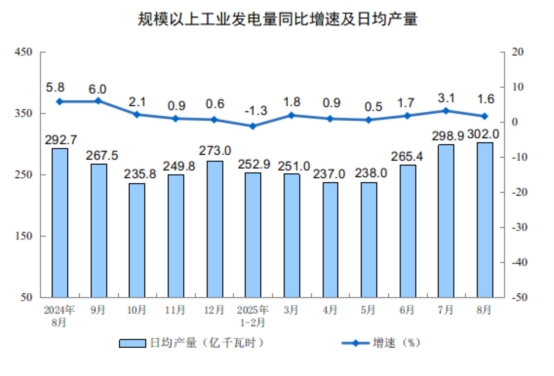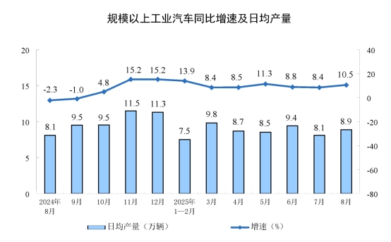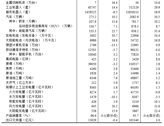 分產(chǎn)品看,8月份,規(guī)模以上工業(yè)623種產(chǎn)品中有319種產(chǎn)品產(chǎn)量同比增長。其中,鋼材12277萬噸,同比增長9.7%;水泥14802萬噸,下降6.2%;十種有色金屬698萬噸,增長3.8%;乙烯314萬噸,增長10.4%;汽車275.2萬輛,增長10.5%,其中新能源汽車133.3萬輛,增長22.7%;發(fā)電量9363億千瓦時,增長1.6%;原油加工量6346萬噸,增長7.6%。
