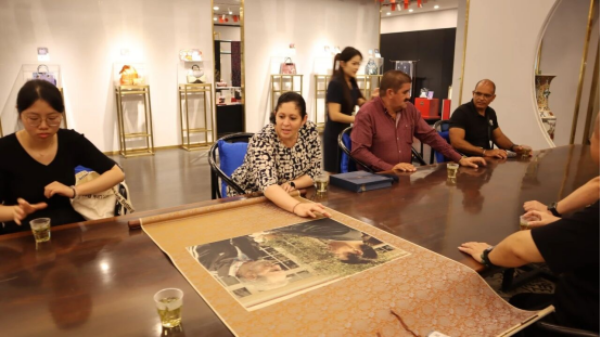 在上久楷宋錦國(guó)禮展廳,代表團(tuán)一行觀看了多件曾作為國(guó)禮贈(zèng)送給外國(guó)領(lǐng)導(dǎo)人的宋錦國(guó)禮。這些作品不僅工藝精湛,更蘊(yùn)含深厚的文化底蘊(yùn)和外交意義。吳建華董事長(zhǎng)介紹了上久楷在國(guó)禮設(shè)計(jì)、制作方面的創(chuàng)新與成就,以及如何通過(guò)絲綢這一載體,向世界展示中國(guó)文化的魅力。