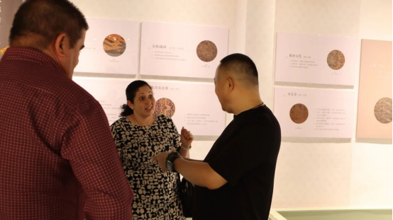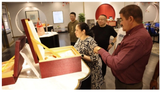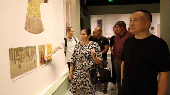 在吳建華董事長(zhǎng)的陪同下,古巴代表團(tuán)一行首先參觀了上久楷宋錦文化園。文化園內(nèi)陳列著大量歷史文獻(xiàn)資料、實(shí)物及現(xiàn)代創(chuàng)新作品,全面展示了宋錦從古至今的發(fā)展歷程。代表團(tuán)成員對(duì)宋錦的千年織造歷史表現(xiàn)出濃厚興趣,不時(shí)駐足細(xì)看,詢(xún)問(wèn)宋錦的織造工藝、圖案寓意及文化內(nèi)涵。