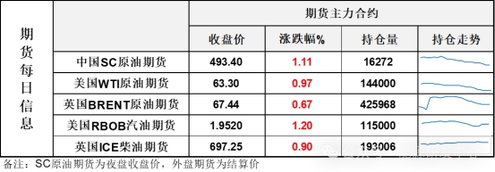 【1】WTI主力原油期貨收漲0.61美元,漲幅0.97%,報63.3美元/桶;布倫特主力原油期貨收漲0.45美元,漲幅0.67%,報67.44美元/桶;INE原油期貨收漲1.11%,報493.4元。