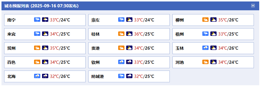 今天晚上,全區(qū)多云到晴,其中防城港、欽州、百色等市有分散陣雨或雷雨、局地大雨或暴雨。