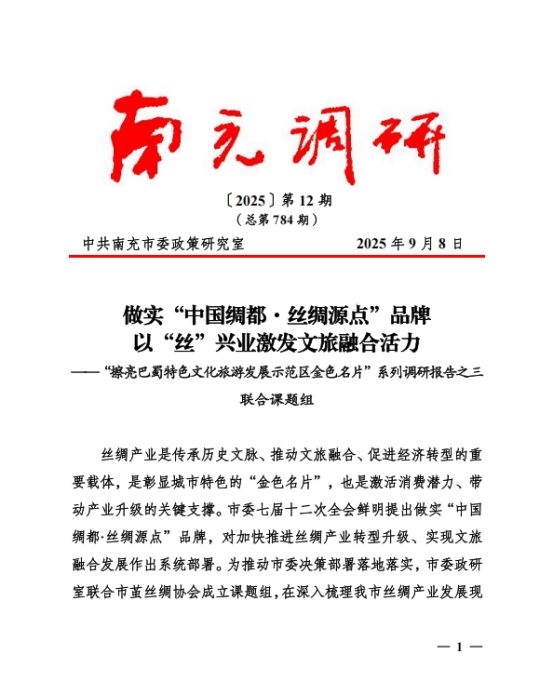 近日,中共南充市委政策研究室聯(lián)合市繭絲綢協(xié)會成立課題組,圍繞市委七屆十二次全會鮮明提出的“做實‘中國綢都?絲綢源點’品牌,加快推進(jìn)絲綢產(chǎn)業(yè)轉(zhuǎn)型升級、實現(xiàn)文旅融合發(fā)展”系統(tǒng)部署開展專項工作。課題組成員吳明鑫、馮政,市繭絲綢協(xié)會李偉一行深入調(diào)研南充市絲綢產(chǎn)業(yè),撰寫的《做實“中國綢都?絲綢源點”品牌 以“絲”興業(yè)激發(fā)文旅融合活力》調(diào)研報告,從南充現(xiàn)狀梳理、外地經(jīng)驗借鑒、下步工作建議3個方面對產(chǎn)業(yè)進(jìn)行了深入分析。