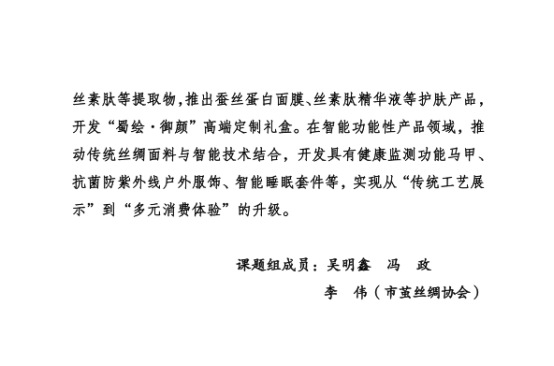 再是借鑒外地經(jīng)驗,從政策支持、科技創(chuàng)新、文化賦能、產(chǎn)業(yè)鏈整合、跨界融合拓展等方面舉例闡述,并提出下一步工作建議:一是完善產(chǎn)業(yè)鏈條,增強(qiáng)產(chǎn)業(yè)協(xié)同能力;二是強(qiáng)化品牌建設(shè),提升品牌影響力;三是加強(qiáng)科技創(chuàng)新,提升產(chǎn)品附加值;四是深化文旅融合,促進(jìn)產(chǎn)業(yè)轉(zhuǎn)型升級,為南充絲綢行業(yè)未來發(fā)展提供重要理論支持和決策參考。