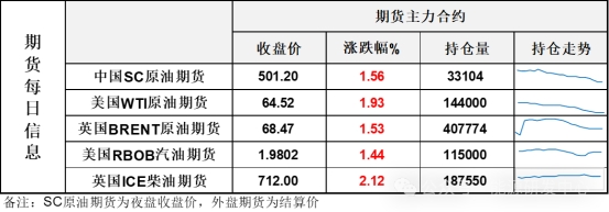 【1】WTI主力原油期貨收漲1.22美元,漲幅1.93%,報(bào)64.52美元/桶;布倫特主力原油期貨收漲1.03美元,漲幅1.53%,報(bào)68.47美元/桶;INE原油期貨收漲1.56%,報(bào)501.2元。