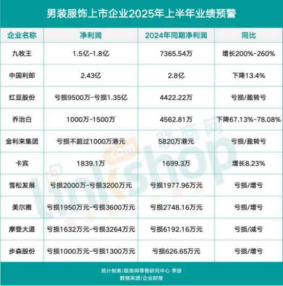男裝方面來看,目前發(fā)布的10家企業(yè)中,有6家出現(xiàn)虧損。男裝版塊最賺錢的則是中國(guó)利郎,2025年上半年中國(guó)利郎凈利潤(rùn)為2.43億元。此外,雪松發(fā)展、美爾雅、步森股份增虧,摩登大道減虧。