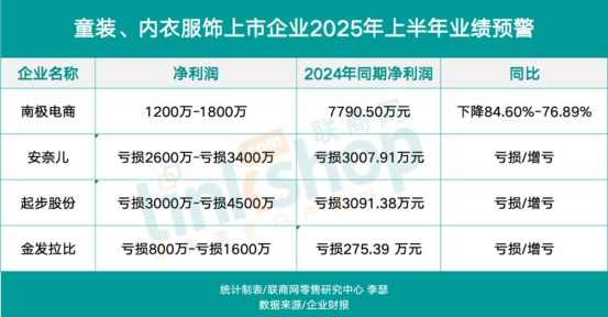 目前三家童裝企業(yè)發(fā)布盈利預(yù)警,均出現(xiàn)虧損。內(nèi)衣方面,目前僅南極電商發(fā)布公告,錄得下滑。