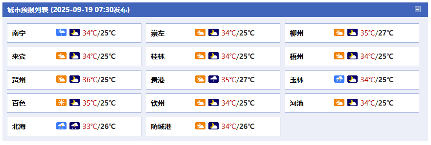 今天白天,賀州、梧州、玉林、貴港、防城港、欽州、北海等市有陣雨或雷雨、局地大雨,其它地區(qū)多云到晴有分散陣雨或雷雨。全區(qū)大部最高氣溫33~35℃。