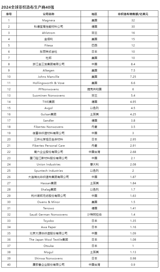 據(jù)了解,該榜單以2024年非織造布業(yè)務的銷售額為排名依據(jù)。盡管美國、日本、西歐等成熟市場仍是全球領先非織造布企業(yè)的重要聚集地,但新興市場企業(yè)的影響力正加速提升,成為推動行業(yè)格局演變的關鍵力量,其中,巴西、土耳其、中國、印度尼西亞等國家的企業(yè)表現(xiàn)尤為突出。