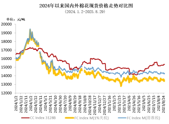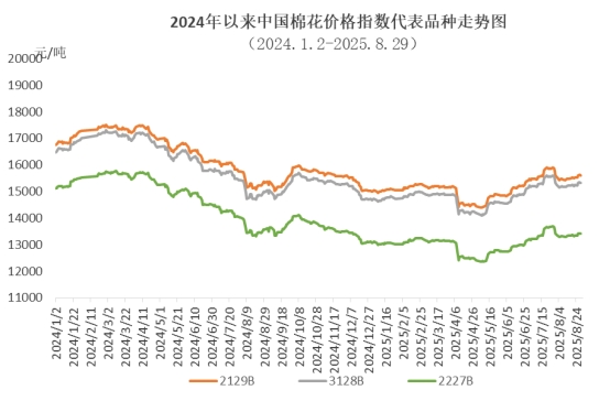 8月,國內棉價呈先降后升走勢。月初因新棉增產,市場供大于需求,棉價快速回落;隨后在國民經濟運行總體平穩(wěn)、中美斯德哥爾摩經貿會談等利好消息帶動下震蕩回升,月底增發(fā)20萬噸棉花進口配額,對棉價影響較小。同期,國際棉價走勢偏震蕩回落,主要受美聯儲降息預期增強、美國對多國對等關稅正常政策生效、美棉簽約出口持續(xù)疲軟等因素影響。