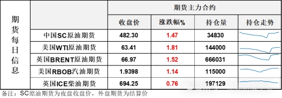【1】WTI主力原油期貨收漲1.13美元,漲幅1.81%,報63.41美元/桶;布倫特主力原油期貨收漲1美元,漲幅1.52%,報66.97美元/桶;INE原油期貨收漲1.47%,報482.3元。
