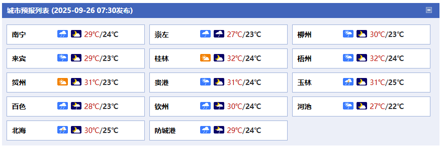 今天白天,百色、崇左、防城港、南寧等市有中雨、局地大雨或暴雨,其它地區(qū)多云有陣雨或雷雨。