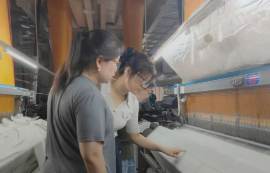 會后,老師們走進(jìn)生產(chǎn)車間,了解劍桿提花織機(jī)的裝造規(guī)格及現(xiàn)有品種的織造過程,并在織機(jī)上與設(shè)計(jì)人員一同探討花型織造中出現(xiàn)的問題。