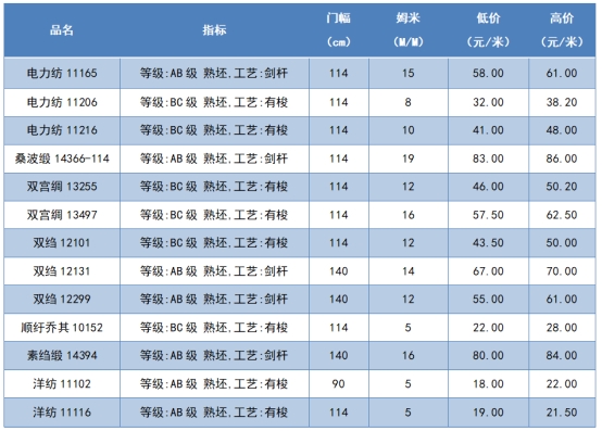 本周綢緞指數(shù)協(xié)作單位成交價(jià)格區(qū)間