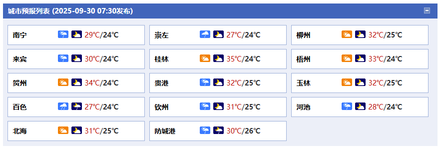 南寧市:今天白天多云有陣雨,今天晚上多云、局地有陣雨,東南風2~3級,最高氣溫29℃,最低氣溫24℃。