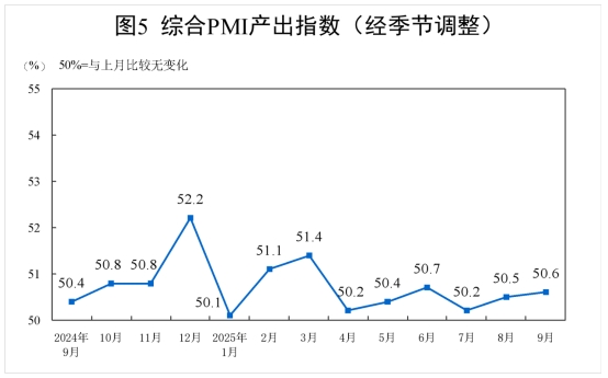 9月份,綜合PMI產(chǎn)出指數(shù)為50.6%,比上月上升0.1個(gè)百分點(diǎn),持續(xù)高于臨界點(diǎn),表明我國(guó)企業(yè)生產(chǎn)經(jīng)營(yíng)活動(dòng)總體擴(kuò)張繼續(xù)加快。