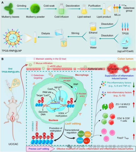 鑒于此,肖波教授團(tuán)隊開發(fā)了一種經(jīng)實驗室優(yōu)化的口服遞送平臺:將靶向 Lsd1的RNP封裝進(jìn)桑葉來源的脂質(zhì)納米顆粒(MLLs),并加入FDA批準(zhǔn)的穩(wěn)定劑d-α-生育酚聚乙二醇琥珀酸酯(TPGS)(圖1A)。TPGS的引入顯著增強(qiáng)了LNP的脂質(zhì)雙分子層穩(wěn)定性,使其能夠在胃腸環(huán)境中高效遞送RNP,并提高了其穿透結(jié)腸黏液屏障的能力。進(jìn)一步地,TPGS-RNP@LNPs通過上皮細(xì)胞增強(qiáng)通透與滯留效應(yīng)(EPR效應(yīng))在炎癥結(jié)腸組織中富集,并通過半乳糖受體實現(xiàn)對巨噬細(xì)胞的特異性靶向。同時,納米顆粒與內(nèi)體膜的膜融合機(jī)制結(jié)合Cas9的核定位信號,確保了RNP的高效核遞送。最終,該系統(tǒng)在小鼠中實現(xiàn)了顯著的基因編輯效果,并有效緩解了UC和CAC(圖1B)。