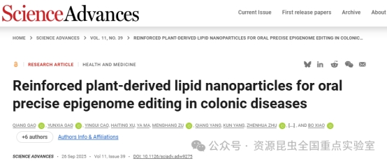 近日,肖波教授、石瀟瀟副教授團(tuán)隊在國際著名期刊Science Advances(Science子刊)上發(fā)表了題為“Reinforced plant- derived lipid nanoparticles for oral precise epigenome editing in colonic diseases”的研究論文。