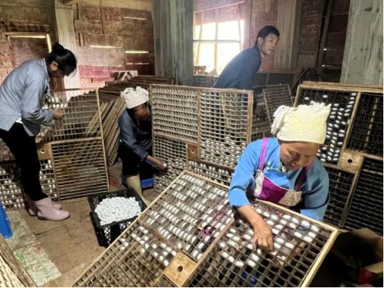 在蔡梅的示范帶動(dòng)下,田房村及周邊掀起“黨員帶頭干、群眾跟著上”的熱潮。農(nóng)戶們利用房前屋后空地、閑置房屋發(fā)展“微養(yǎng)殖”,投資小、見效快的家庭作坊模式迅速推廣。隨著養(yǎng)蠶戶增多,產(chǎn)業(yè)規(guī)模不斷擴(kuò)大,蠶繭收購從“散戶零售”升級(jí)為收購商“上門直收”,運(yùn)輸成本降低40%,村民們實(shí)現(xiàn)“掙錢顧家兩不誤”,有效破解農(nóng)村留守難題。目前,僅蔡梅直接帶動(dòng)的養(yǎng)蠶戶就超70戶,桑蠶成為了村民增收致富的“綠色引擎”。