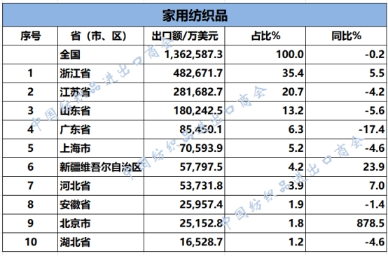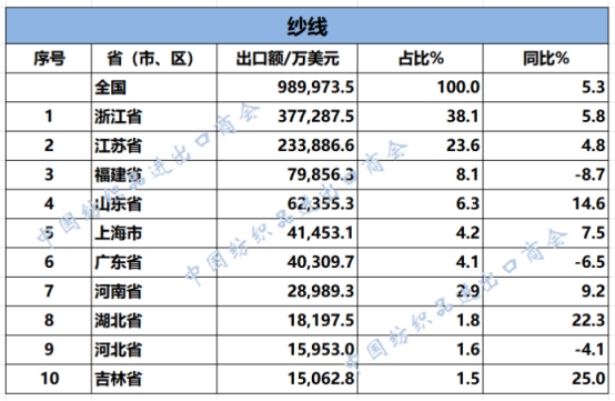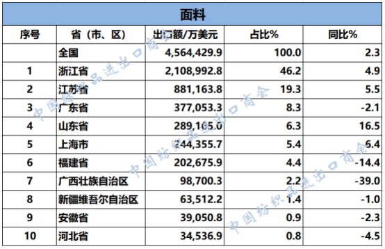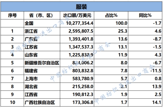 2025年1-8月紡織服裝類重點(diǎn)商品出口前十名的省(市、區(qū))