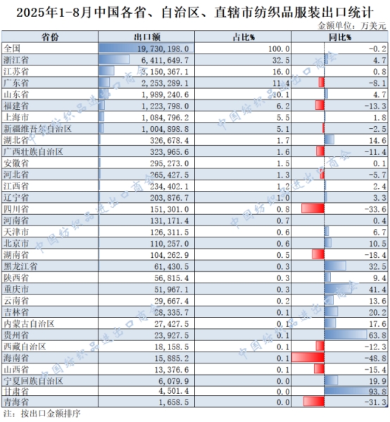 2025年1-8月,我國紡織服裝累計(jì)出口1973.02億美元,同比下降0.2%。浙江省、江蘇省、廣東省、山東省、福建省分別列全國紡織服裝出口省市前五位,合計(jì)比重超七成。
