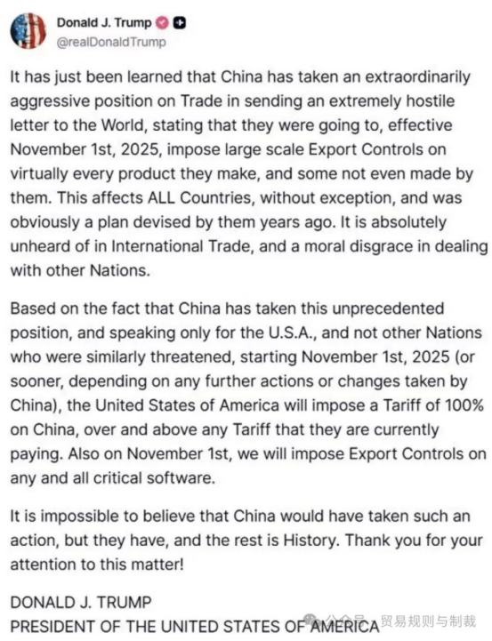 當(dāng)?shù)貢r間2025年10月10日,美國總統(tǒng)特朗普在社交媒體上宣布:從11月1日起,對中國產(chǎn)品征收100%關(guān)稅;并對所有關(guān)鍵軟件實施出口管制。理由是,中國在10日9日發(fā)布對相關(guān)稀土實施出口管制的決定。在此消息影響下,S&P500指數(shù)當(dāng)日跌幅達(dá)-3.5%,在6個小時內(nèi)損失2.5萬億美元。