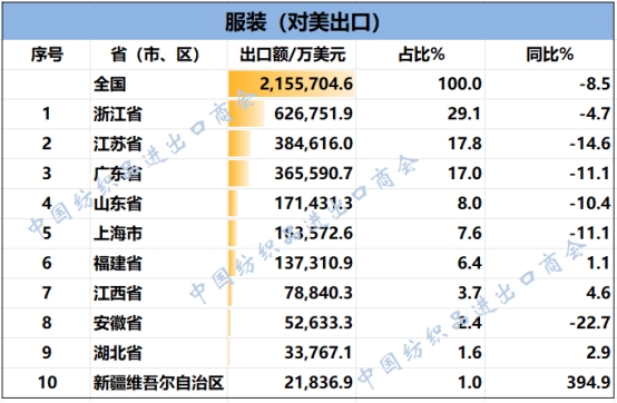 2025年1-8月我國紡織服裝重點(diǎn)省市對美出口概況
