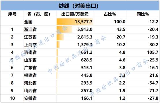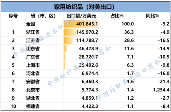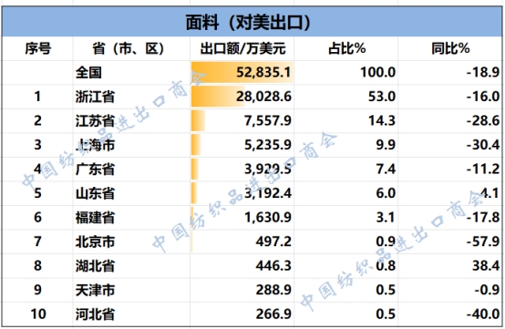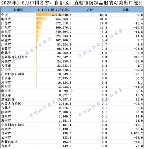 2025年1-8月,我國紡織服裝累計(jì)對美出口301.88億美元,同比下降9%。浙江省、江蘇省、廣東省、山東省、上海分別列全國紡織服裝對美出口省市前五位,合計(jì)比重超八成。