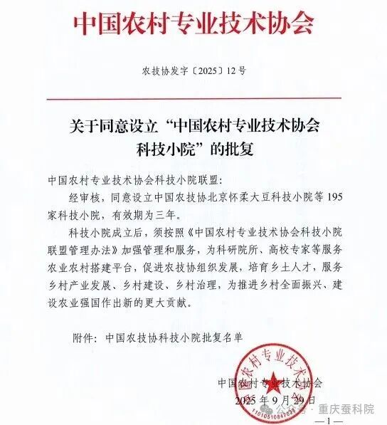 近日,中國農(nóng)村專業(yè)技術(shù)協(xié)會發(fā)布《關(guān)于同意設(shè)立“中國農(nóng)村專業(yè)技術(shù)協(xié)會科技小院”的批復(fù)》(農(nóng)技協(xié)發(fā)字〔2025〕12號),重慶市蠶業(yè)科學(xué)技術(shù)研究院參與共建的“浙江越城蠶種科技小院”獲批設(shè)立。