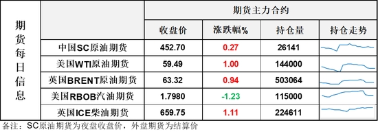 【1】WTI主力原油期貨收漲0.59美元,漲幅1%,報(bào)59.49美元/桶;布倫特主力原油期貨收漲0.59美元,漲幅0.94%,報(bào)63.32美元/桶;INE原油期貨收漲0.27%,報(bào)452.7元。
