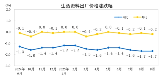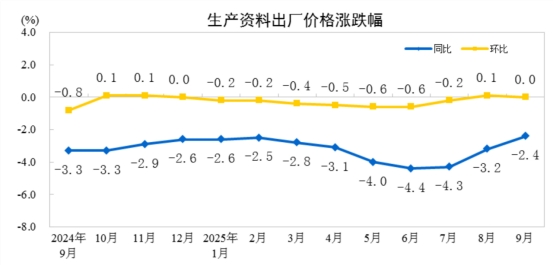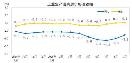 2025年9月份,全國(guó)工業(yè)生產(chǎn)者出廠價(jià)格同比下降2.3%,降幅比上月收窄0.6個(gè)百分點(diǎn),環(huán)比繼續(xù)持平。工業(yè)生產(chǎn)者購(gòu)進(jìn)價(jià)格同比下降3.1%,降幅比上月收窄0.9個(gè)百分點(diǎn),環(huán)比上漲0.1%。1—9月平均,工業(yè)生產(chǎn)者出廠價(jià)格比上年同期下降2.8%,工業(yè)生產(chǎn)者購(gòu)進(jìn)價(jià)格下降3.2%。