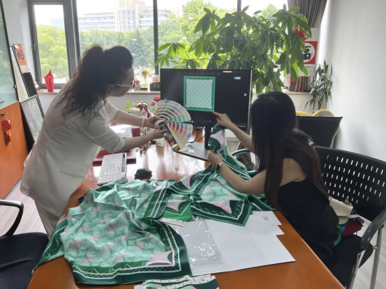 作為此次合作的執(zhí)行者,蘇豪股份始終以“傳承絲綢文化,引領(lǐng)品質(zhì)生活”為己任,牽頭組織開(kāi)展具體創(chuàng)作設(shè)計(jì),而香港高等教育科技學(xué)院則在設(shè)計(jì)創(chuàng)新與理念表達(dá)上獨(dú)具優(yōu)勢(shì)。雙方自合作啟動(dòng)之初,便確立了“以綠色為核,以文化為魂”的創(chuàng)作方向,蘇豪股份設(shè)計(jì)團(tuán)隊(duì)和港方團(tuán)隊(duì)歷經(jīng)數(shù)月的反復(fù)研討、靈感碰撞與工藝打磨,最終將抽象的理念與情感,轉(zhuǎn)化為可觸摸、可佩戴的精致織物 ,精致的絲綢樣品得到有關(guān)方面的一致認(rèn)可。