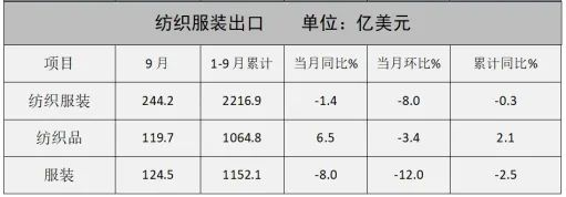 最新海關(guān)總署數(shù)據(jù)顯示,9月紡織品出口同比增長6.5%,展現(xiàn)出較強(qiáng)的市場韌性;而服裝出口則同比下降8%,盡管降幅較上月略有收窄,但整體仍顯疲軟。