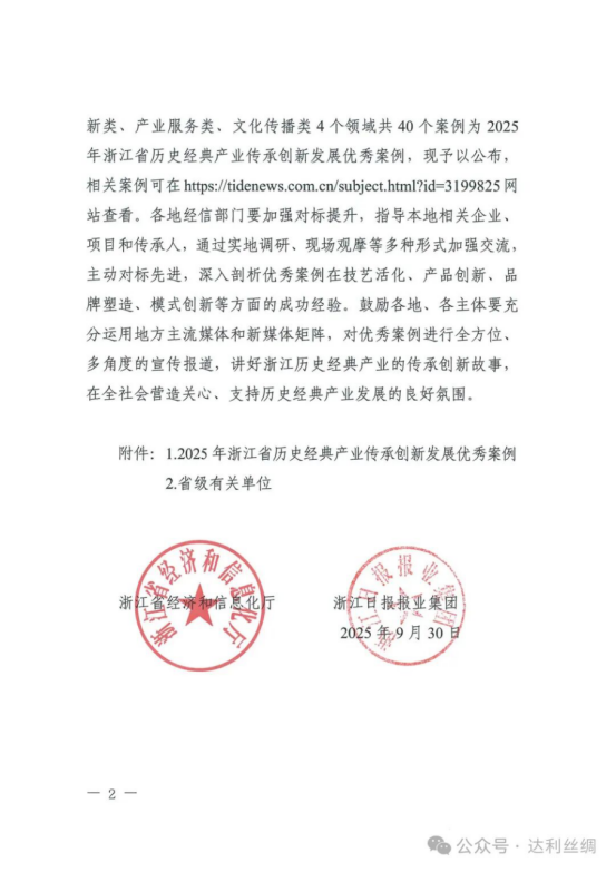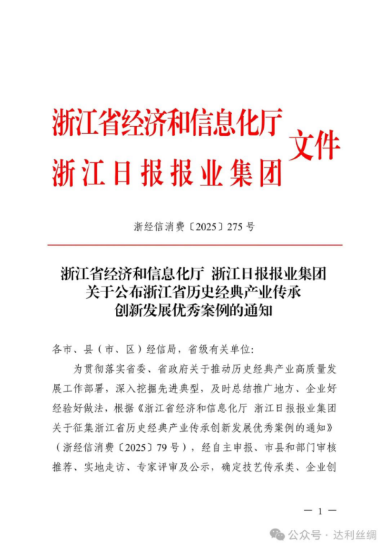 絲企新聞丨達利絲綢入選2025年浙江省歷史經(jīng)典產(chǎn)業(yè)傳承創(chuàng)新發(fā)展優(yōu)秀案例