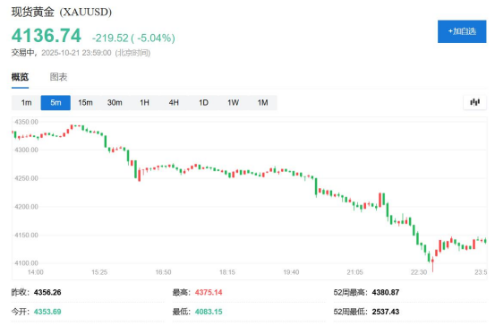 截至周一連續(xù)第六個交易日創(chuàng)盤中歷史新高的黃金(582, 8.80, 1.54%)創(chuàng)十二年來最大跌幅。美股早盤時段刷新日低時,現(xiàn)貨黃金逼近4082美元,日內(nèi)跌約6.3%,創(chuàng)2013年4月以來最大日內(nèi)跌幅,紐約期金跌至4093美元,日內(nèi)跌6.1%。