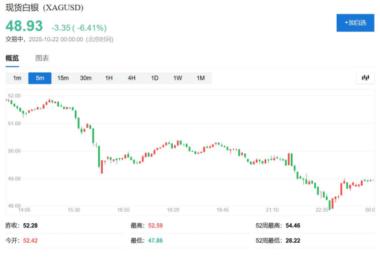 白銀(8131, -9.00, -0.11%)也在美股早盤刷新日低,現(xiàn)貨白銀跌至47.90美元下方,日內(nèi)跌近8.7%,創(chuàng)2021年2月以來最大盤中跌幅,紐約期銀跌至47.12美元,日內(nèi)跌約8.3%。