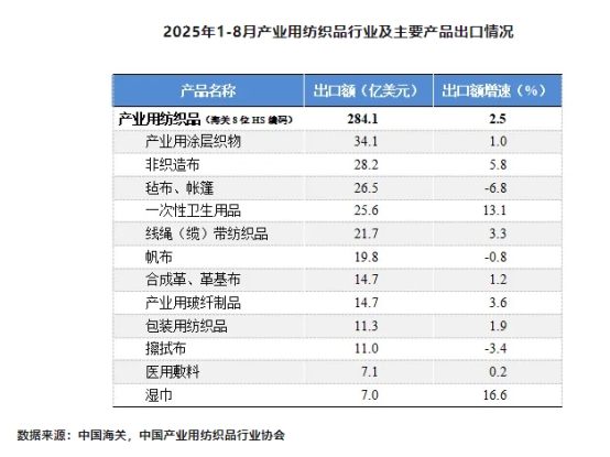 分產(chǎn)品來看,2025年1-8月,行業(yè)最大出口產(chǎn)品產(chǎn)業(yè)用涂層織物的出口額為34.1億美元,同比增長1%;非織造布的出口額位居行業(yè)第二,達到28.2億美元,同比增長5.8%,同期出口量為110.8萬噸,同比增長12.2%;氈布/帳篷的出口額為26.5億美元,同比下降6.8%;一次性衛(wèi)生用品(尿褲、衛(wèi)生巾等)的出口額為25.6億美元,同比增長13.1%;其他重點產(chǎn)品方面,產(chǎn)業(yè)用玻纖制品、線繩(纜)帶紡織品、包裝用紡織品和革基布的出口額分別同比增長3.6%、3.3%、1.9%和1.2%;擦拭類產(chǎn)品方面,擦拭布(不含濕巾)的出口額為11億美元,同比下降3.4%,濕巾出口額達到7億美元,同比增長16.6%。